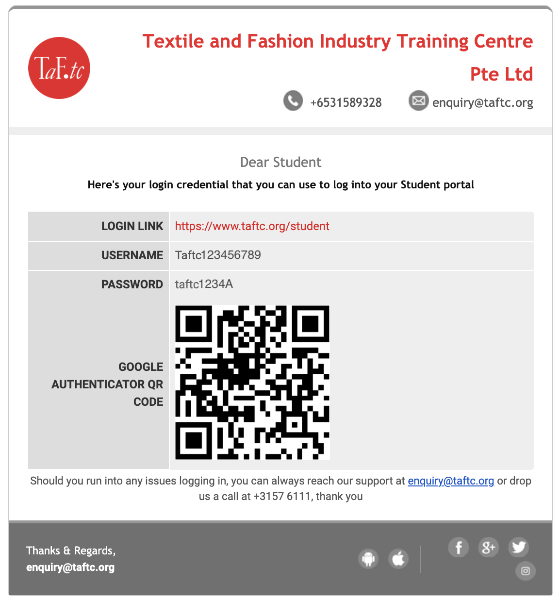 - Upon signing up you will receive an email with your login credentials from “enquiry@taftc.org”.